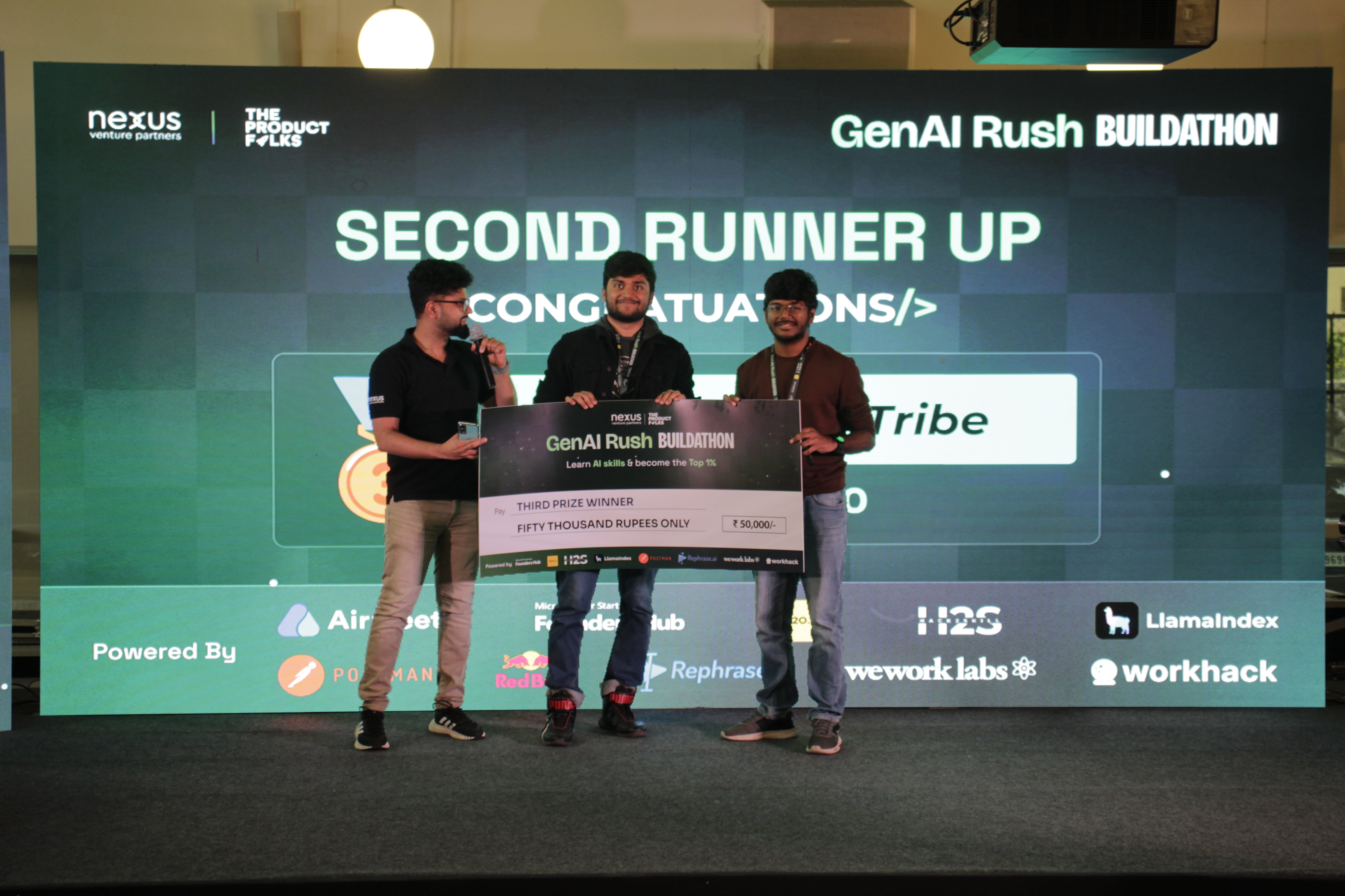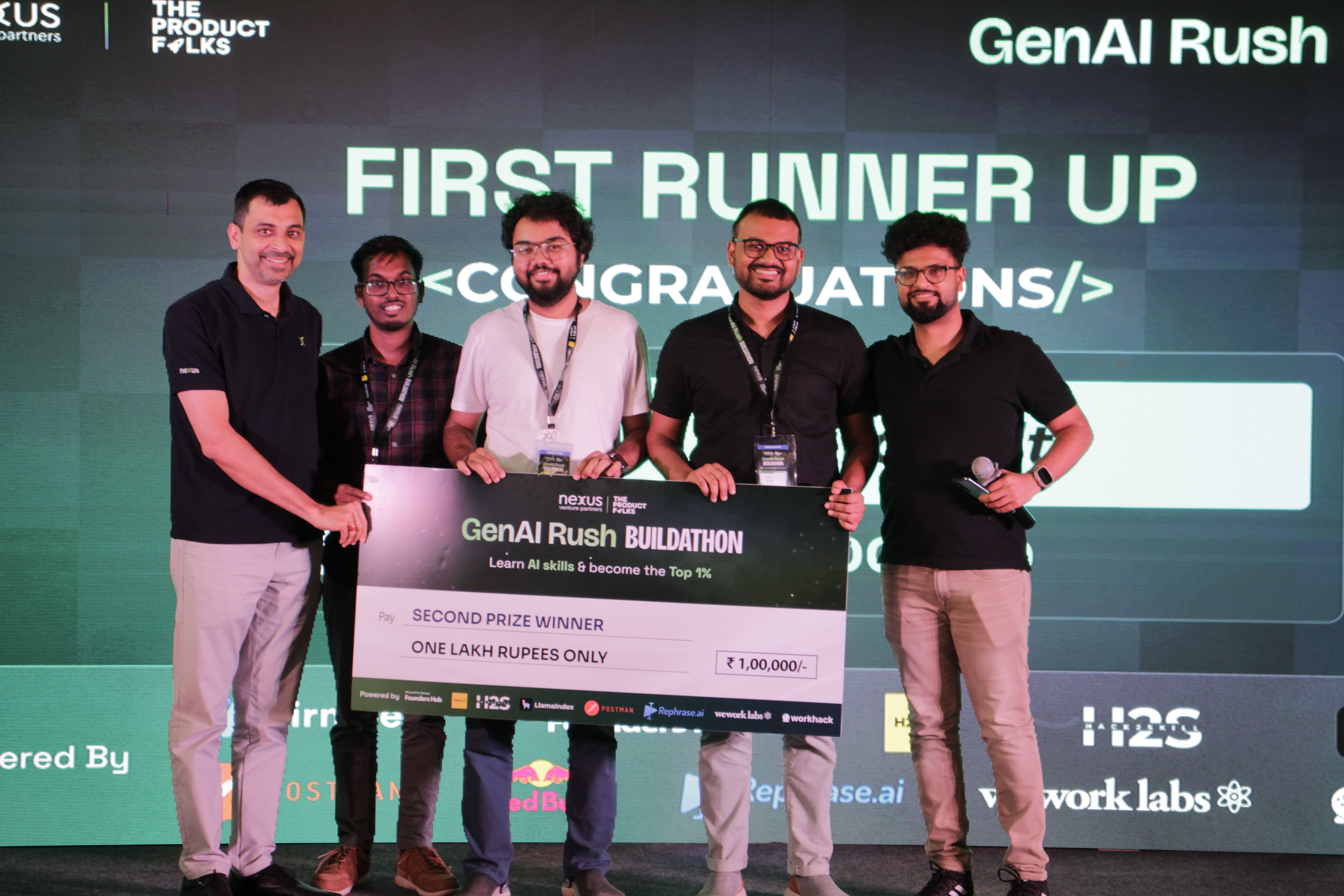 Nexus Venture Partners and The Product Folks present GenAI Rush - Buildathon, powered by Hack2skill, WeWork Labs, Rephrase.ai & Workhack is an exciting 24-hour non-stop Offline Hackathon where you can maximize your learning through practical application! Enroll in the hackathon following the cohort and gain hands-on experience in building the next groundbreaking AI innovation.